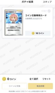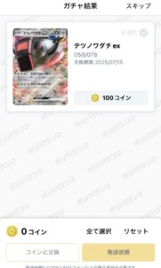 ↓当たったカードはコインに還元できる仕様。100コインで100コイン還元分のカードを引き、100コインと交換。ずっと俺のターンが続きます。